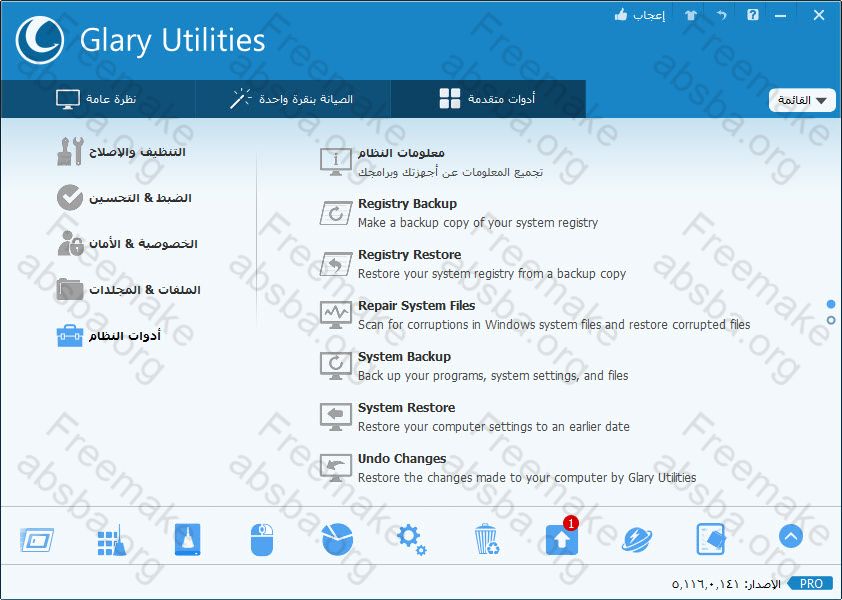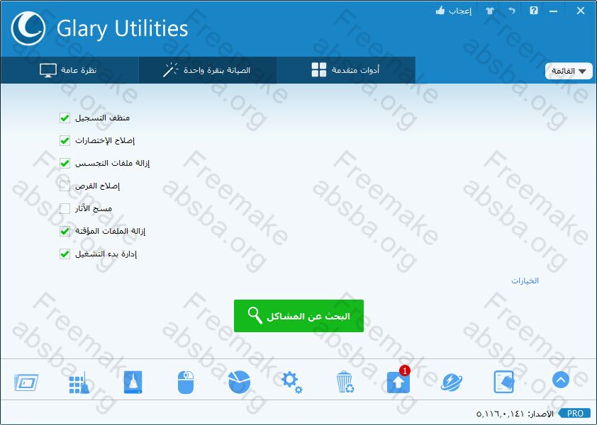 | <div> معلومات عن البرنامج : البرنامج الشامل لصيانة وتنظيف وتسريع نظام الويندوز وجهاز الكمبيوتر، وتحسين متصفحات الانترنت والغاء تثبيت البرمج وتحديث برامج الجهاز وإصلاح مشاكل الويندوز وعمل صيانة شاملة للويندوز والكمبيوتر بضغطة واحدة.برنامج Glary Utilities Pro يعمل على تنظيف مخلفات البرامج ومتصفحات الانترنت وحذف الملفات المهملة والغيرهامة والتي تتسبب في بطئ النظام. كما يعمل برنامج Glary Utilities على إصلاح أخطاء الريجيسترى