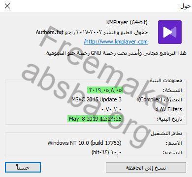بكل سهولة من خلال برنامج كي ام بلاير للكمبيوتر ( يدعم 4K و 8K ) حصري وطازج بتاريخ اليوم إسم الشركة : kmplayer إسم البرنامج ورقم الإصدار : KMPlayer x64 2019.05.8.05 لغة البرنامج : متعدد اللغات ( كوري & عربي & انجليزي ... إلخ ) حجم البرنامج : 43.18 ميغابايت تاريخ الإصدار : 08 / 05 / 2019 الترخيص : مجاني متوافق مع : Windows 7 & Windows 8.1 & Windows 10 All 64 Bit طريقة تنصيب البرنامج : ![]() ![]() ![]() ![]() ![]() ![]() برنامج KMPlayer x64 2019.05.8.05 يحتاج إلى Microsoft Visual C++ 2010 x86 Redistributable 10.0.30319 ![]() ![]() ![]() واجهة البرنامج لـ KMPlayer x64 2019.05.8.05 ( بالضغط على كلمة KMPlayer في أعلى البرنامج تظهر القائمه المنسدلة التي بالصوره ) ![]() الآن سوف يتم عرض الفيديو نسبة العرض إلى الإرتفاع ( 16:9 ) ![]() الخيارات ( F2 ) لاعب * اللغة * ![]() اللغات التي يدعمها برنامج KMPlayer x64 2019.05.8.05 ![]() تنسيقات ( الصيغ التي يدعمها KMPlayer 64X 2019 ) ![]() المفاتيح ( Keyboard ) أوامر ( اختصارات لوحة المفاتيح ) ![]() وضع ملء الشاشة ![]() الفلاتر الداخلية ![]() المتنوعة ( التحكم بالألوان & دعم اليوتيوب إلى جودة 4K ) ![]() صوره لإثبات إصدار البرنامج ![]() لتحميل البرنامج ( رابط مباشر من الشركة ) : إضغط هنا |