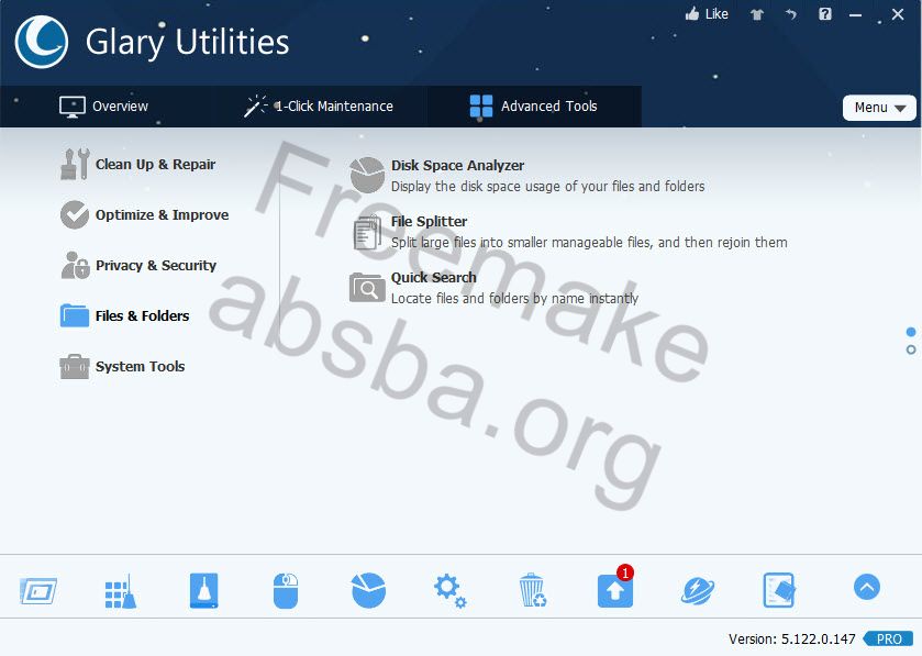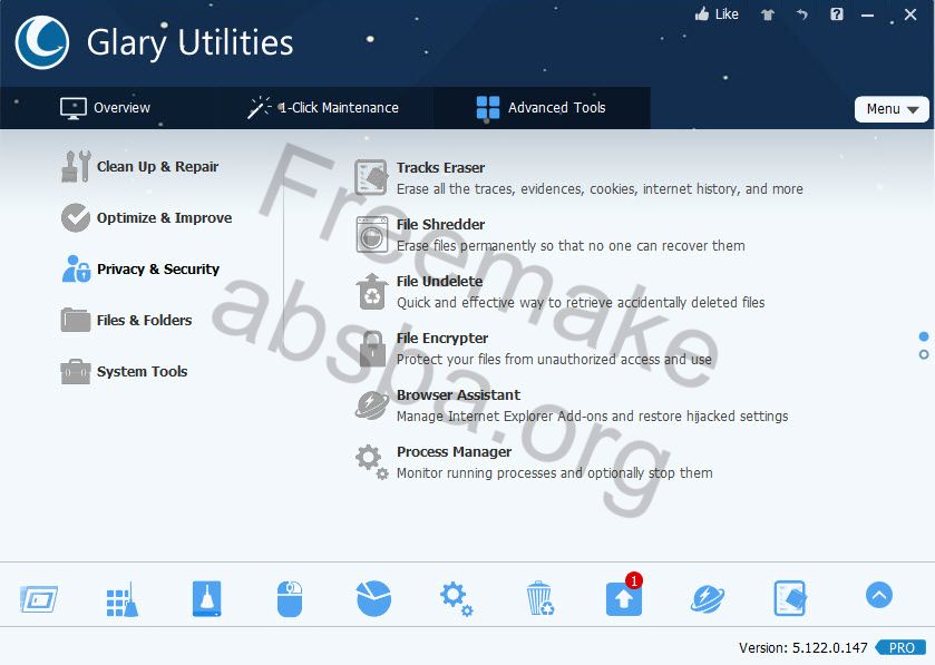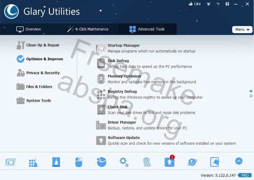 | <div> معلومات عن البرنامج : البرنامج الشامل لصيانة وتنظيف وتسريع نظام الويندوز وجهاز الكمبيوتر، وتحسين متصفحات الانترنت والغاء تثبيت البرمج وتحديث برامج الجهاز وإصلاح مشاكل الويندوز وعمل صيانة شاملة للويندوز والكمبيوتر بضغطة واحدة.برنامج Glary Utilities Pro يعمل على تنظيف مخلفات البرامج ومتصفحات الانترنت وحذف الملفات المهملة والغيرهامة والتي تتسبب في بطئ النظام. كما يعمل برنامج Glary Utilities على إصلاح أخطاء الريجيسترى