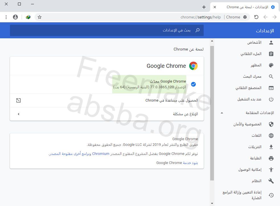 حصري وطازج بـ تاريخ اليوم إسم الشركة : Google إسم البرنامج ورقم الإصدار : Google Chrome 77.0.3865.120 الإصدار : Final ( النهاني ) لغة البرنامج : متعدد اللغات ( إنجليزي & عربي & ألماني ... إلخ ) حجم البرنامج لكلا النظامين : 64 بت و 32 بت النسخه الأولى : ( لايمكن عمل تحديث * يجب تحميل نسخه جديده * ) : نظام 64 بت : 53.58 ميغابايت & نظام 32 بت : 52.97 ميغابايت النسخه الثانيه : ( ** يمكن عمل تحديث لها من نفس المتصفح ** ) نظام 64 بت : 55.69 ميغابايت & نظام 32 بت : 55.08 ميغابايت تاريخ الإصدار : 10 / 10 / 2019 الترخيص : مجاني متوفق مع : Windows 7 & Windows 8.1 & Windows 10 صوره للمتصفح ![]() ![]() القائمة المنسدله التي بها جميع إعدادات المتصفح ![]() جميع إعدادات البرنامج أ- الأشخاص : chrome://settings/people ![]() ب- الملء التلقائي : chrome://settings/autofill ![]() ت- المظهر : chrome://settings/appearance ![]() ث- محرك البحث : chrome://settings/search ![]() ج- المتصفح التلقائي : chrome://settings/defaultBrowser ![]() ح- عند بدء التشغيل : chrome://settings/onStartup ![]() الإعدادات المتقدمه خ- الخصوصية والأمان : chrome://settings/privacy ![]() د- اللغات : إضافة اللغات chrome://settings/languages ![]() تستطيع إضافة أي لغه أو البحث عنها ![]() ذ- التنزيلات : chrome://settings/downloads ![]() ر- الطباعة : chrome://settings/printing ![]() ز- إمكانية الوصول : chrome://settings/accessibility ![]() س- النظام : chrome://settings/system ![]() ش- إعادة التعيين وإزالة البرامج الضارة : chrome://settings/reset ![]() ص- الإضافات : chrome://extensions ![]() ض- إختصارات لوحة المفاتيح ( الإضافات ) : chrome://extensions/shortcuts ![]() صوره لإثبات إصدار البرنامج ( Google Chrome 77.0.3865.120 ) ( النسخه الأولى ) : لاتستطيع تحديث المتصفح ![]() ( النسخه الثانيه ) : تستطيع تحديث المتصفح إلى إصدارات أحدث ![]() أولا : تحميل النسخه الأولى ( لايمكن عمل تحديث من نفس المتصفح لأي إصدار جديد ) ( * يجب تحميل نسخه جديده * ) لتحميل البرنامج لنظام 64 بت ( رابط مباشر من الشركة ) : إضغط هنا أو هنا أو هنا لتحميل البرنامج لنظام 32 بت ( رابط مباشر من الشركة ) : إضغط هنا أو هنا أو هنا لتحميل البرنامج لنظام 64 بت ( رابط على موقع mediafire ) : إضغط هنا لتحميل البرنامج لنظام 32 بت ( رابط على موقع mediafire ) : إضغط هنا ثانيا : تحميل النسخه الثانيه ( يمكن عمل تحديث من نفس المتصفح لأي إصدار جديد ) ( ** تحديث من نفس المتصفح ** ) لتحميل البرنامج لنظام 64 بت ( رابط مباشر من الشركة ) : إضغط هنا لتحميل البرنامج لنظام 32 بت ( رابط مباشر من الشركة ) : إضغط هنا لتحميل البرنامج لنظام 64 بت ( رابط على موقع mediafire ) : إضغط هنا لتحميل البرنامج لنظام 32 بت ( رابط على موقع mediafire ) : إضغط هنا |