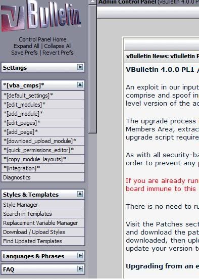 I went to Manage products and found that vbadvanced was still in there. So I ran uninstall and it completed. I log off and log back in to make sure all was clear, and I get the following: http://img.photobucket.com/albums/v2.../vbulliten.jpg I even removed the 2 last files in 'admincp' - which were 'vba_cmps_admin.php' and 'vbacmps_install.php" to make sure everything was cleared out of my directory. When clicking on the CMPS it goes to a dead page because i've deleted everything in it. What's my next step from here to get my vbulliten 4.0 running back to 100% normal? Thanks, beatings are welcome. Adam __DEFINE_LIKE_SHARE__ |