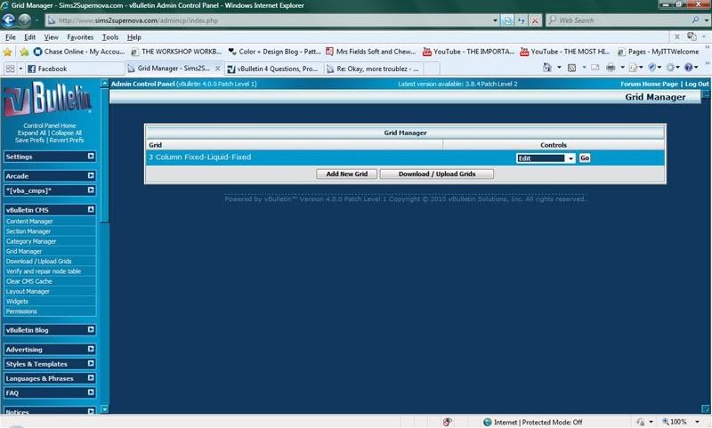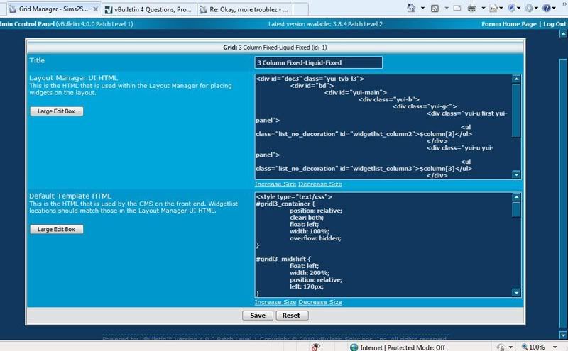 | Hello, I am trying to customize my CMS homepage by fixing the size of the modules, but I am having some major troubles. I have contacted a friend who has a vBulletin 4.0 forum and she was able to resize her modules, but her Grid Manager looks way different than mine and we don't know why. Here is how hers look like: http://i148.photobucket.com/albums/s...eenShot005.jpg http://i148.photobucket.com/albums/s...eenShot006.jpg And here is how mine looks: http://i655.photobucket.com/albums/u...le/gridman.jpg http://i655.photobucket.com/albums/u...idman_edit.jpg For some reason, I only have layout listed in my Grid Manager and when I click on 'Edit', I get some HTML code while my friend's Grid Manager has actual options listed. The only difference between her forum and mine is that she's running 4.0.2 and I'm running 4.0.0. Is this maybe a version issue and I just need to upgrade? Since I was playing around with it, now my CMS homepage is completely blank. I think this is because I was missing with the sizes under the StyleVar settings. Can someone help me please?