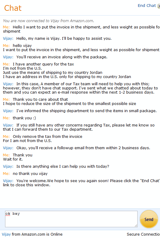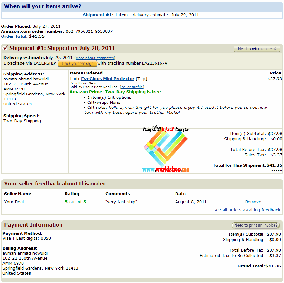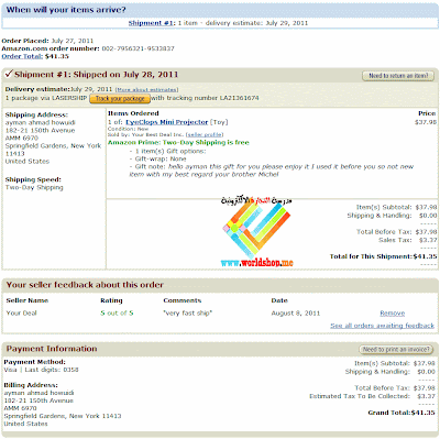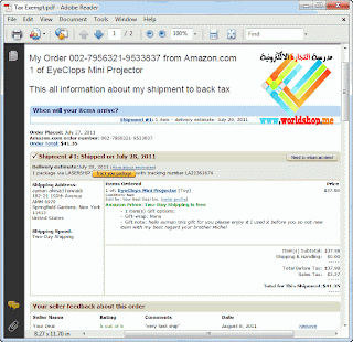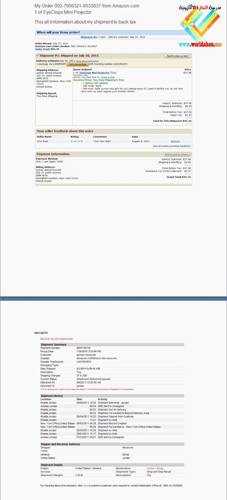 اولا معلومات منقولة تمام كما حدث معي احببت ان اشاركها واختصر الوقت على نفسي والشكر لمن قام بكتابتها وانا بدوري قمت بالايضاح بالصور وهي مدعمه من قبلي ملاحظة الطريقة لجميع المواقع التي تاخذ ضريبة في بلدها فقط بامكانك استرجاع الضريبة لاي مشتريات من الخارج مايجب أن نعلمه هنا أن هذه الضرائب حسب القوانين في أمريكا تحتسب على المواطنين والمقيمين في أمريكا وقد سمعت سابقاً أكثر من قصة أن بعض الطلاب أو الذين يعملون في أمريكا وتحتسب عليهم ضرائب عند الشراء يقومون بالاحتفاظ بالفواتير ويقومون بابرازها في المطار حين مغادرتهم من أمريكا(شرط أن تكون السلعة المشتراة معهم وسيقومون بإخراجها من أمريكا) فيستردون قيمة الضرائب المحتسبة عليهم. نعم، هذا هو القانون عندهم .. السلع التي تشترى من أمريكا وتشحن خارجها .. ليس عليها ضرائب هذه الضرائب تحتسب علينا لأن الكثير من المواقع لا يشحن خارج أمريكا، فنقوم نحن بارسالها إلى عناوين داخل أمريكا ثم اعادة ارسالها إلى بلداننا. المهم في الموضوع ... أني بحثت في هذا الأمر وقمت بمراسلة موقع Amazon وشرحت لهم الأمر بجميع تفاصيله التي ذكرتها في الأعلى وأننا نقوم بإعادة ارسال هذه السلع إلى بلداننا .. فعليه أنه من حقنا أن نسترجع هذه المبالغ شرحت لهم الموضوع عن طريق الـ chat، فأخبرني الموظف أنه ليس لديه معلومات كاملة عن الموضوع وأنه سيحول الموضوع للفريق المسئول عن الضرائب في Amazon وسيتم الرد خلال 72 ساعة هذه محور كلامي معاهم على الشات الخاص بهم بالفعل تم الرد على الاستفسار وهذا ماوصلني (والرد بالانجليزي موجود تحت) وفيه طريقة استرجاع الضرائب المحتسبة على المشتريات في حال تم اخراجها من الأراضي الأمريكية لكي تسترد المبلغ نحتاج إلى 1- نسخة من بوليصة الشحن (والمقصود بها بوليصة الشحن من أمريكا إلى بلدك) التي يصدرها وكيل الشحن وهو Aramex أو worldship أو MyUS أو غيرهم ممن تتعاملون معهم ويجب أن تحتوي بوضوح على الوجهة النهائية للشحن (وذلك لاثبات أنها خرجت من أمريكا) وقائمة بمحتويات الشحنة (وذلك لاثبات أن نفس البضاعة التس اشتريتها منهم هي التي تم شحنها لخارج أمريكا) 2- تقوم بإرسال هذه البوليصة إلى هذا الفاكس 2062662005 أو ترسله في ملف PDF إلى tax-exempt ![]() 3- اذكر في الفاكس أو الايميل رقم الطلبية من أمازون (وهذا الرقم تجده حين تدخل على طلباتك، كل طلبية لها رقم)، واذكر ايميلك المسجل به في Amazon (رقم الطلبية مهم وذلك لاثبات أن نفس البضاعة التي اشتريتها منهم - المذكورة تفاصيلها في البوليصة (خطوة رقم 1) هي التي تم شحنها لخارج أمريكا) 4- حين ترسل فاكس ضع في رأس الورقة "Attn: Tax Exempt." وهو المعروف عندنا "إلى عناية..." حين اكتمال هذه المعلومات وارسالها سيقوم الموقع بإعادة قيمة الضرائب إلى بطاقتك الائتمانية وهذا الكلام المفترض أنه ينطبق على جميع المواقع الأخرى غير Amazon فقط .. اذا اشتريت من أي موقع وقام باحتساب ضرائب عليك قم بمراسلته للتأكد من الطريقة لاسترجاع هذه الضرائب أحببت أن تكون الطريقة على موقع Amazon لأنه الموقع الأشهر ... ونكمل عملية اجراءات ارسال لاسترداد الضريبة اول شئ نطبق الشرط الاول وهو بولصه تتبع شحنتك ونجيبها من شركات الشحن وبما اني من ارامكس رحت على شوب اند شيب وكما التالي نلاقي الشحنه مع رقم الشحن حقها واسم الامازون والخ نضغط عليها ونصور حركات التتبع للشحنه وتنطبق على اي شركه شحن تمام نصورها برنت سكرين والحين نروح على الامازون وعلى الفاتوره التي اصدرت لعملية الشراء ونصورها نفس الشئ والحين طريقة عمل ملف pdf من خلال الاوفيس ورد نفتح الاوفيس ونحط الصور ونكتب انه هاي شحنتي رقم كذا واسمها واخر شئ هذه المعلومات التي تتعلق في شحنتي طبعا انت تكتبها بس انا اعطيت مثال فقط وهذه بيانات شحنتي لا احد يكتبها ترا ما يعطوك ضريبه يقولو يلعب علينا كما بالشكل التالي ونحط الصور تحتها الي اخذنا برنت سكرين My Order 002-7956321-9533837 from Amazon.com 1 of EyeClops Mini Projector This all information about my shipment to back tax وبعدين نروح على حفظ وطبعا الاوفيس 2007 ما يجي فيه حفظ