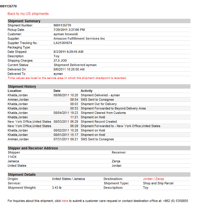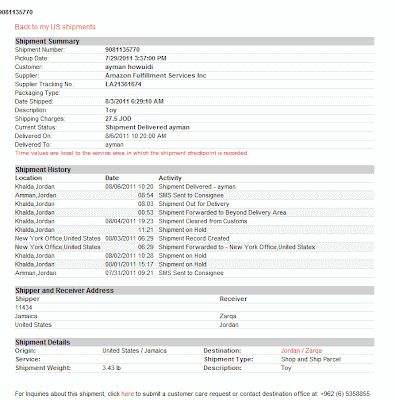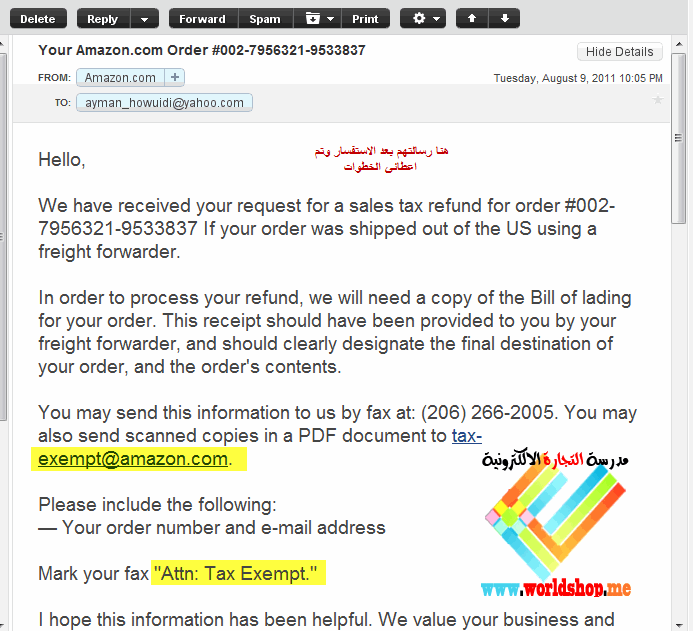 اولا معلومات منقولة تمام كما حدث معي احببت ان اشاركها واختصر الوقت على نفسي والشكر لمن قام بكتابتها وانا بدوري قمت بالايضاح بالصور وهي مدعمه من قبلي ملاحظة الطريقة لجميع المواقع التي تاخذ ضريبة في بلدها فقط بامكانك استرجاع الضريبة لاي مشتريات من الخارج مايجب أن نعلمه هنا أن هذه الضرائب حسب القوانين في أمريكا تحتسب على المواطنين والمقيمين في أمريكا وقد سمعت سابقاً أكثر من قصة أن بعض الطلاب أو الذين يعملون في أمريكا وتحتسب عليهم ضرائب عند الشراء يقومون بالاحتفاظ بالفواتير ويقومون بابرازها في المطار حين مغادرتهم من أمريكا(شرط أن تكون السلعة المشتراة معهم وسيقومون بإخراجها من أمريكا) فيستردون قيمة الضرائب المحتسبة عليهم. نعم، هذا هو القانون عندهم .. السلع التي تشترى من أمريكا وتشحن خارجها .. ليس عليها ضرائب هذه الضرائب تحتسب علينا لأن الكثير من المواقع لا يشحن خارج أمريكا، فنقوم نحن بارسالها إلى عناوين داخل أمريكا ثم اعادة ارسالها إلى بلداننا. المهم في الموضوع ... أني بحثت في هذا الأمر وقمت بمراسلة موقع Amazon وشرحت لهم الأمر بجميع تفاصيله التي ذكرتها في الأعلى وأننا نقوم بإعادة ارسال هذه السلع إلى بلداننا .. فعليه أنه من حقنا أن نسترجع هذه المبالغ شرحت لهم الموضوع عن طريق الـ chat، فأخبرني الموظف أنه ليس لديه معلومات كاملة عن الموضوع وأنه سيحول الموضوع للفريق المسئول عن الضرائب في Amazon وسيتم الرد خلال 72 ساعة هذه محور كلامي معاهم على الشات الخاص بهم بالفعل تم الرد على الاستفسار وهذا ماوصلني (والرد بالانجليزي موجود تحت) وفيه طريقة استرجاع الضرائب المحتسبة على المشتريات في حال تم اخراجها من الأراضي الأمريكية لكي تسترد المبلغ نحتاج إلى 1- نسخة من بوليصة الشحن (والمقصود بها بوليصة الشحن من أمريكا إلى بلدك) التي يصدرها وكيل الشحن وهو Aramex أو worldship أو MyUS أو غيرهم ممن تتعاملون معهم ويجب أن تحتوي بوضوح على الوجهة النهائية للشحن (وذلك لاثبات أنها خرجت من أمريكا) وقائمة بمحتويات الشحنة (وذلك لاثبات أن نفس البضاعة التس اشتريتها منهم هي التي تم شحنها لخارج أمريكا) 2- تقوم بإرسال هذه البوليصة إلى هذا الفاكس 2062662005 أو ترسله في ملف PDF إلى tax-exempt amazon.com3- اذكر في الفاكس أو الايميل رقم الطلبية من أمازون (وهذا الرقم تجده حين تدخل على طلباتك، كل طلبية لها رقم)، واذكر ايميلك المسجل به في Amazon (رقم الطلبية مهم وذلك لاثبات أن نفس البضاعة التي اشتريتها منهم - المذكورة تفاصيلها في البوليصة (خطوة رقم 1) هي التي تم شحنها لخارج أمريكا) 4- حين ترسل فاكس ضع في رأس الورقة "Attn: Tax Exempt." وهو المعروف عندنا "إلى عناية..." حين اكتمال هذه المعلومات وارسالها سيقوم الموقع بإعادة قيمة الضرائب إلى بطاقتك الائتمانية وهذا الكلام المفترض أنه ينطبق على جميع المواقع الأخرى غير Amazon فقط .. اذا اشتريت من أي موقع وقام باحتساب ضرائب عليك قم بمراسلته للتأكد من الطريقة لاسترجاع هذه الضرائب أحببت أن تكون الطريقة على موقع Amazon لأنه الموقع الأشهر ... ونكمل عملية اجراءات ارسال لاسترداد الضريبة اول شئ نطبق الشرط الاول وهو بولصه تتبع شحنتك ونجيبها من شركات الشحن وبما اني من ارامكس رحت على شوب اند شيب وكما التالي نلاقي الشحنه مع رقم الشحن حقها واسم الامازون والخ نضغط عليها ونصور حركات التتبع للشحنه وتنطبق على اي شركه شحن تمام نصورها برنت سكرين والحين نروح على الامازون وعلى الفاتوره التي اصدرت لعملية الشراء ونصورها نفس الشئ والحين طريقة عمل ملف pdf من خلال الاوفيس ورد نفتح الاوفيس ونحط الصور ونكتب انه هاي شحنتي رقم كذا واسمها واخر شئ هذه المعلومات التي تتعلق في شحنتي طبعا انت تكتبها بس انا اعطيت مثال فقط وهذه بيانات شحنتي لا احد يكتبها ترا ما يعطوك ضريبه يقولو يلعب علينا كما بالشكل التالي ونحط الصور تحتها الي اخذنا برنت سكرين My Order 002-7956321-9533837 from Amazon.com 1 of EyeClops Mini Projector This all information about my shipment to back tax وبعدين نروح على حفظ وطبعا الاوفيس 2007 ما يجي فيه ح