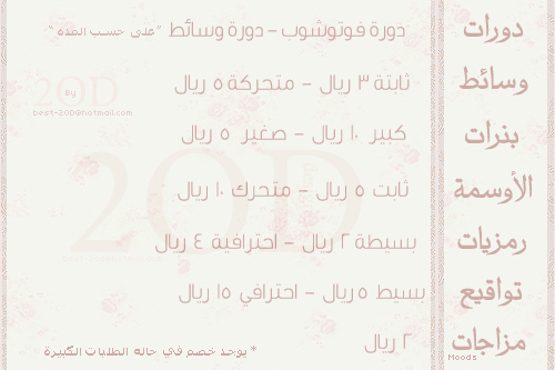 | _ بسم الله ، وعلى بركة الله نبدأ مُصممين سعوديين محترفين يأخذون من التصميم هوايه قبلَ مهنه ، سنقوم أن شاء الله بخدمات تصميم متنوعه من تجهيز منتديات ، وتنشيط بمواضيع . أساس تعامُلنا الأحترام والثقه المتبادله - راح نعرض هنا بعض الأعمال : ![]() ![]() رمزيات (أحترافيه) ![]() ![]() توقيع (أحترافي) ![]() ![]() ![]() ![]() mms ( متحركه ) ![]() ![]() mms ( ثابته ) ![]() ![]() ![]() ![]() (بنرات) ![]() ![]() ![]() ![]() ![]() ![]() مزاجات (moods) الأسعار : * هذه الأسعار لطلبات الصغيرة ، اما في حاله الطلبات الكبيره فهناك خصم كبير .![]() + ستايلات - السعر 150 ريال (دون تقطيع وتركيب) + تنشيط منتديات بمواضيع وتواقيع وبيكات - السعر حسب الأتفاق على العدد - (لا تتضمن ردود) ![]() + إنشاء (بطاقه شخصية ) ، وحساب تمبلر وتجهيزة وتنسيقه - بـ 100 ريال - للتواصل عن طريق الأيميل: [email protected] (أضافه) - والله وليّ التوفيق ![]() _