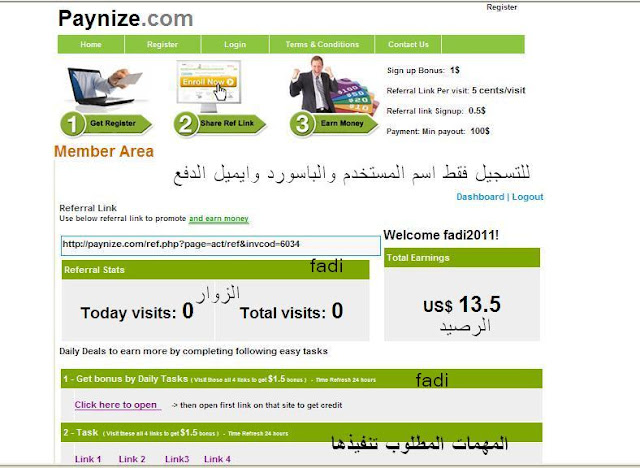 مميزات الشركة • احصل على 1$ عند التسجيل • 50 سنت لاي زيارة عن طريق رابطك • 1 $ لكل ريفرال عن طريقك • الحد الادنى 100$ المهمات التي يجب عليك تنفيذها دخول الى المواقع ضغط على روابط لبعض الاعلانات تنزيل بعض البرامج من وصلة معينة التسجيـــــــــل WWW.PAYNIZE.COM وارجو من الاخوة الاعضاء التسجيل عن طريقى لدعمى ارجو من الاخوة الاعضاء التسجيل عن طريقى لدعمى من هنــــــــــــا ( حب لاخيك ما تحبه لنفسك ) وبالتوفيق لكل الاعضاء والاخوة |