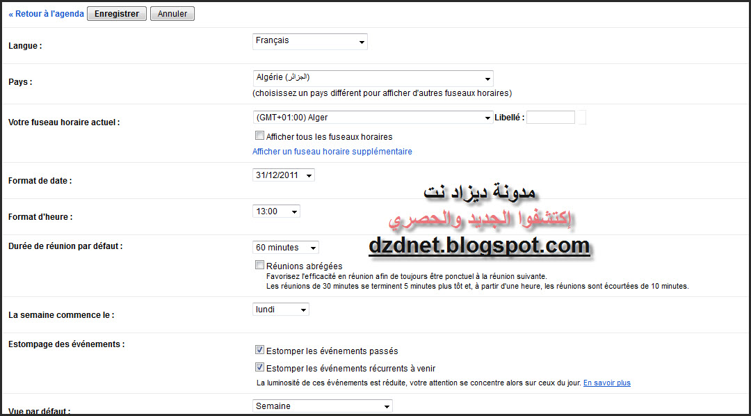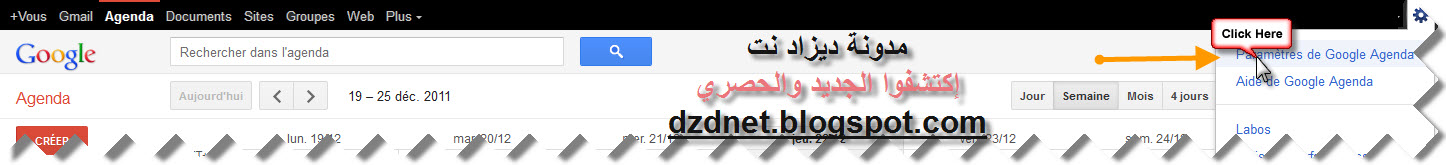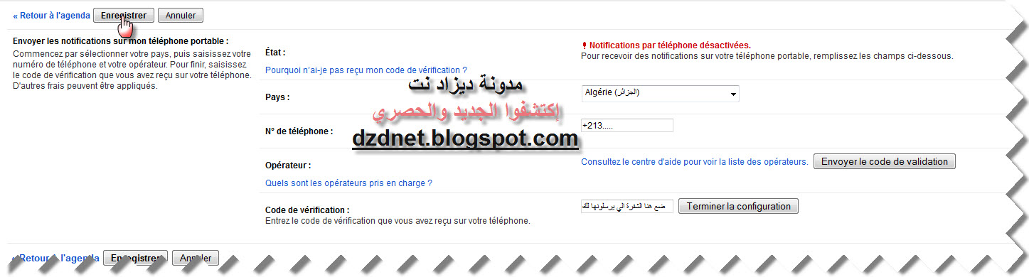 | السلام عليكم ورحمة الله تعالى وبركاته جيميل ، خدمة ، منبه ، Agenda ، جدول شهري ، Gmail ، جيميل ،جديد ، خدمة ، حصري،أس أم أس ، dzdnet،مدونة ، تميز،sms ،رسالة ![]() مدونة ديزاد نت شرحنا اليوم يتطرق الى كيفية اضافة خدمة جوجل الى هواتف نقالة بتدكيرك بمواعيد عن طريق رسالة Sms اولاً يجب ان يكون لديك حساب في جيميل Gmail ندخل الى هدا الموقع https://accounts.google.com/ManageAccount ونضغط على Plus ![]() ثانياً : نختار أجوندا المطلوبة ثالثاً : نقوم بتوجه نحو Parametre de google Agenda ![]() رابعاً: نقوم بضبظ اعدادات الوقت الي يخبرك برسالة أس أم أس عبر هاتف نقال ثم نحفظ العمل ![]() خامساً وأخيراً : نقوم بضبظ البيانات كما هو مبين في صورة ![]() فإن أحسنت فمن الله ، وإن أسأت أو أخطأت فمن نفسي والشيطان لا تنسوا دعاء الينا و لوالدينا إقرأ المزيد على مدونة ديزاد نت من اليوم جوجل سوف يدكرك بأمورك عن طريق sms | مدونة ديزاد نت |