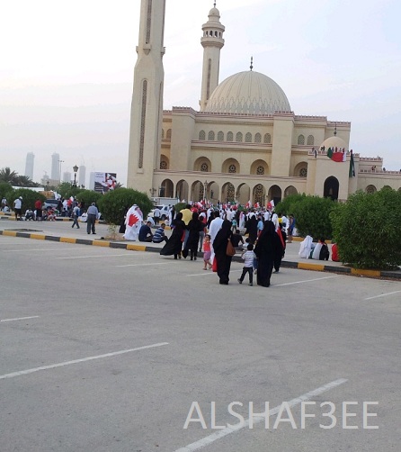 بدأت بالسير بإتجاه الجامع وحولي بعض العائلات تترجل من سياراتها، وقد اتشح الأطفال بالأعلام البحرينية والسعودية ووصلت إلى المدخل وكان هناك بعض الآسيويين يعرضون الأعلام والتذكارات للبيع. وأصبت بالدهشة لرؤيتي مواقف السيارات الداخلية للجامع شبه خالية إلا من بعض المارة هنا وهناك. وصلت للساحة المجهزة بالمنصة ولاحظت أن الحضور هزيل حيث كانت هناك أعداداً كبيرة من الكراسي الخالية حتى تلك اللحظة تنتظر من يجلس عليها. بحثت لي عن مكانٍ مناسب أستطيع منه التقاط بعض الصور بشكلٍ واضح وبينما كنت أكتب بعض التغريدات فاجأني أحد الآسيويين وهو يحمل بيده مغلفاً يحوي صور للقيادة السياسية يقوم بتوزيعها فأخذت نسخاً منه، وهنا التبس الأمر عليّ هل يقوم الائتلاف بتوزيع صور القيادة أم أن الفعالية تُدار من قِبل الحكومة ؟!!!