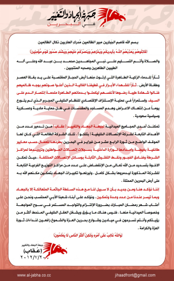 | 7/20: (عقاب) تنفذ عملية ( شهدائكم شهدائنا ) وتدمر عدد من الأهداف التابعة لشركة الإتصالات الخليفية بـِسم الله قاصِم الجَبارين مبيِر الظالمِيِن مُدرِكِ الهاربيِن نكال الظالِميِن (قَاتِلُوهُمْ يُعَذِّبْهُمُ اللَّـهُ بِأَيدِيكُمْ وَيُخْزِهِمْ وَيَنصُرْكُمْ عَلَيْهِمْ وَيَشْفِ صُدُورَ قَوْمٍ مُّؤْمِنِينَ) والصلاة وأتم التسليم على نبي المجاهدين محمد بن عبد الله وعلى أله الطيبين الطاهرين وصحبه المنتجبين . ثـَأراً لِلدماء الزكية الطاهرة التي إرتوت مِنها أرض الحجاز المغتصبة على يد بغاة العصر وطغاة الأرض . ثأراً للشهداء الأبرار في قطيفنا الغالية الذين أعلوا صوتهم بوجه ظالميهم فنالوا شهادة طيبة رضوها لأنفسهم ليكملوا بدمائهم الطاهرة ملحمة إنتصار الدم على السيف. وإستمراراً في عملية الإستنزاف الإقتصادي للنظام الخليفي المجرم الذي لم يتورع يوماً عن إنتهاك الاعراض وهدم المساجد والمقدسات في ظل حماية مادية وعسكرية وسياسية سعودية . تمكنت أحدى المجاميع الميدانية لجبهة الجهاد والتغيير ( عقاب ) من تدمير عدد من الأهداف التابعة لشركة الإتصالات الخليفية ( بتلكو ) . تلك الشركة الظالمة التي كان لها الموقف الواضح من ثورة الرابع عشر من فبراير في البحرين بطردها للعمال حسب معايير طائفية بغيضة وإمدادها لوزارة الداخلية بسجلات إتصالات المواطنين وتزويدها لمراكز الشرطة وفنادق الفجور ونقط التفتيش الثابتة بوسائل الإتصالات المختلفة . حيث تمكن الاخوة بتسديد من الله تعالى من الإنقضاض على عدد من مراكز التوزيع الفرعية التابعة للشركة المذكورة ليدمروها بشكل كامل . وليرفعوا تكبيرات الجهاد بتمكين مكنهم الله به على أرض البحرين المحتلة . إننا نؤكد هنا ومن جديد بأن لا سبيل لنا مع هذه السلطة الجاثمة المتهالكة إلا بالجهاد وبما تيسر عندنا من عدد وعدة وتمكين . ونؤكد على أبناء شعبنا الأبي المحتسب ونحن على أعتاب شهر رمضان المبارك بضرورة الإلتزام والتواجد المستمر في سوح المواجهة وخصوصاً الميدانية منها . فليس هناك ما يؤرق ويشغل العقل الخليفي المنحط أكثر من رؤيتكم وأنتم تسرحون في ميادين وشوارع بحرين العزة والشموخ رافعين لنداءات ثورة العزة والكرامة (وَاللَّهُ غَالِبٌ عَلَى أَمْرِهِ وَلَكِنَّ أَكْثَرَ النَّاسِ لَا يَعْلَمُونَ) جبهة الجهاد والتغيير ( عقاب ) 2012/7/20 الجمعة http://www.al-jabha.co.cc/ |