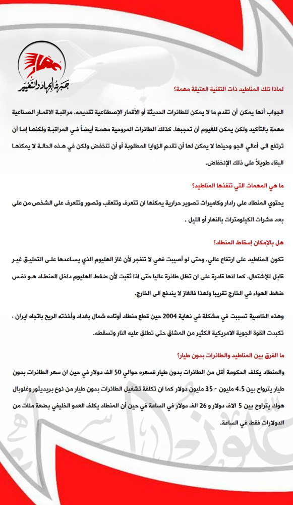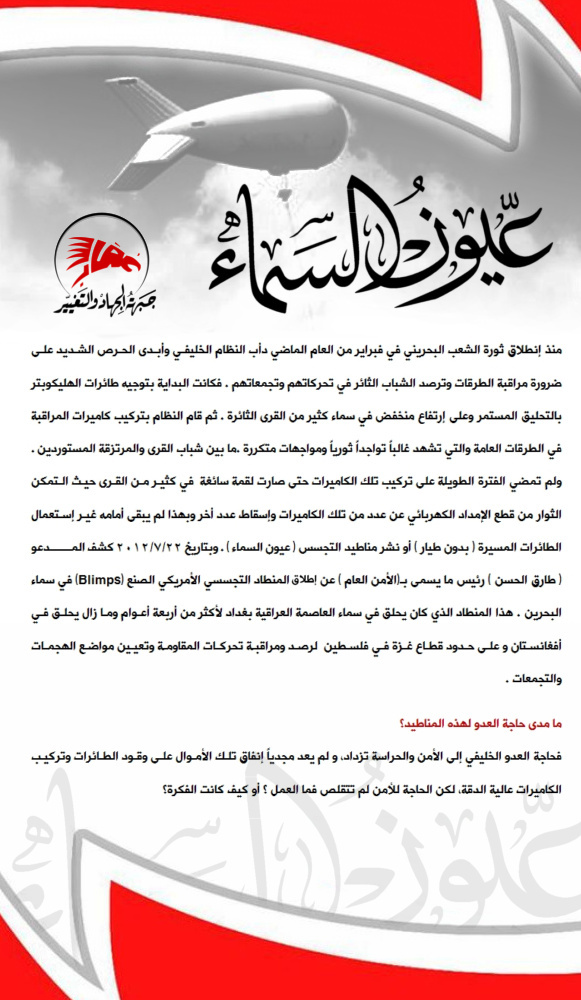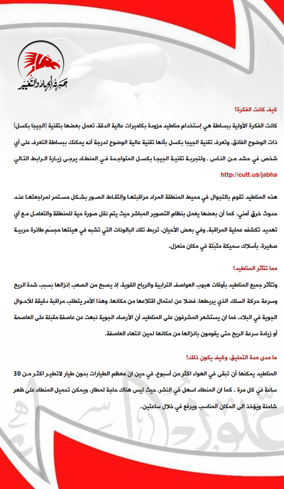 | (عُقاب) تصدر تقرير شامل عن مناطيد وزارة الإرهاب بإسم (عيون السماء) ![]() ![]() ![]() ![]() كما يمكنكم الإطلاع على التقرير ومشاركته عبر (google docs) عبر الوصلة http://goo.gl/OIw8g جبهة الجهاد والتغيير (عُقاب) http://www.al-jabha.co.cc/ http://twitter.com/al_jabha [email protected] __DEFINE_LIKE_SHARE__ |