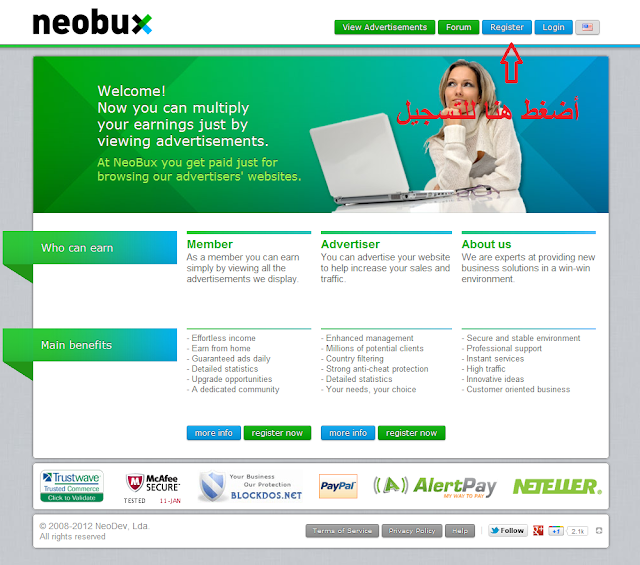و قبل أى حاجة لـتأكيد المصداقية ده فيديو ليا و انا بسحب فلوسى بكارت نيتلر اللى وصلنى لحد البيت من ماكينة الصراف الآلى لبنك مصر على فكرة مش شرط بنك مصر ممكن تسحب من أى ماكينة صراف آلى لأن الكارت اللى هايوصلك ممكن تسحب بيه من أى ماكينة صراف آلى فى العالم --:نبذة عن الشركة:-- تعتبر شركة NeoBux الان هي الاولى على العالم حاليا في مجال الربح من الانترنت و تتصدر دائما قائمة الشركات المفضلة للربح من الانترنت لما لها من مميزات جميلة ومنها الدفع الفوري و تأجير الريفير كما أن الشركة عمرها الآن اكثر من 4 سنوات و هى تدفع بانتظام لمشتركيها منذ بدايتها ولها ترتيب عالي جدا بسبب نظام الدفع التلقائي عالمياً، بل انها الشركة الاولى في موقع Ptctalk كما أن نظام ذكي جدا في المعاملة مع الاعضاء والاعلانات، سوف يتم شرح كل النظام شرح مفصل هنا ان شاء الله كما تتميز بتصميم فلاشي جميل جداً، سهل التعامل خاصة للمبتدئين ![]() --:مميزات الشركة:-- بالنسبة للعضو العادي: سعر الضغطة: من 0,1 الى 2 سنت ضغطة الريفيل المؤجر: نصف سنت للعضو العادى و سنت للعضو الجولدن البنوك المدعومة: Neteller + Alertpay + Paypal الحد الادنى للسحب: 2 دولار مدة الدفع: فـــــــــــوري ممكن المبالغ اللى فاتت دى تبان صغيرة لكن فى طريقة جميلة لزيادة الأرباح أكمل قراءة الشرح لتعرف المزيد ![]() --:شرح الشركة:-- ![]() الشركة تعطيك أموال مقابل تصفح الاعلانات التى تعرضها كل يوم و ده لأن المواقع اللى بتعلن عند الشركة عايزة أكبر عدد من الزوار فا بتدفع للشركة مقابل الاعلان و الشركة بتدى المشتركين جزء من الأرباح فى مقابل مشاهدة الاعلانات للتسجيل فى الشركة اضغط http://www.neobux.com/?r=ekerek شرح التسجيل فى الشركه يتم التوجه للصفحه الرئيسيه فنضغط كما بالصوره للتسجيل ثم بعدها نقوم بملئ صفحة التسجيل كما هو مبين بالصوره التاليه ستعطيك صفحة لا تقم باغلاقها للتفعيل الان اذهب الى ايميلك ستجد رسالة فيها كود التفعيل ![]() قم بلصق كود التفعيل في المكان الموضح في الصورة ![]() انسخ الكود و ضعه فى المكان المخصص له مبروك تم التسجيل بنجاح وبعد ان تقوم بالتفعيل بنجاح سوف تقوم بتسجيل الدخول اضغط على الدخول : Login ملحوظه مكان الباسورد الثانى اتركه فارغا اكتب باسوردك فى مكان الباسورد الاول فقط صورة الخامسوبعد اتمام عملية الدخول ستجد ملفك الشخصي بنفس الشكل التالي كما في الصوره والان اهم نقطه وهى شرح الضغط على الاعلانات اضغط على مشاهدة الاعلانات : View Advertisements بعدها ستقوم بالدخول على كل اعلان ( لا يجوز مشاهده الاعلانات كلها مره واحده لابد ان يكون واحد تلو الاخر) بعد الضغط على الشريط الاخضر سيظهر نقطه حمراء اضغط عليها كما موضح بالصوره انظر اعلى صفحه الاعلان وتابع الشرح على الصور و ساعات الشريط بيبقى فى اخر الصفحة ثم كرر العمليه على باقى الاعلانات (هتلاقى اعلانات برتقالى و خضلراء و بنفسجية اضغطها كلها) وهكذا يوميا ملحوظة مهمة:1- لا تضغط كل الاعلانات فى وقت واحد اضغط اعلان واحد و بعد انتهاؤه و احتساب الربح اضغط الاعلان الذى يليه. 2- مسموح لكل شخص بامتلاك أكونت واحد فقط .. يعنى لو سجلت اكتر من مرة حساباتك كلها هاتتقفل. و دلوقت طريقة مضاعفة الأرباح : لمضاعفه رصيدك الشركة بتعرض طريقة ممتازة لزيادة الأرباح و مضاعفتها عن طريق تأجير الريفيرال أولا ما هو الريفيرال : هو الشخص الذى تدعوه للتسجيل عن طريقك و تأخد نسبة من أرباحه ( أرباحه مش هاتقل لكن الشركة هاتديك عليه فلوس يعنى كل ما هو يكسب انت تكسب) كان الأول الناس تكتب مواضيع فى المنتديات و تدور على ناس يسجلوا عن طريقهم علشان يزيد ربحهم ده حتى ساعات كانوا بيدفعولهم فلوس. لكن مع هذه الشركة العملاقة يمكنك أن توفر مجهودك لأنها تعرض خدمة رائعة تغنيك عن التعب فى احضار أشخاص للتسجيل عن طريقك. و هذه الخدمة الرائعة هى تأجير الريفيرال يعنى من ارباحك من ضغط الاعلانات يمكنك تأجير أشخاص سجلوا من قبل فى الموقع ليكونوا ريفيرال لك و تكسب ارباح مثل التى يربحونها كعمولة أرباحهم لن تتأثر و لكن 