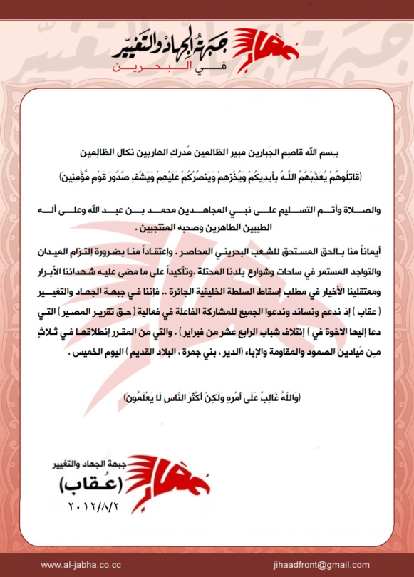 | بـِسم الله قاصِم الجَبارين مبيِر الظالمِيِن مُدرِكِ الهاربيِن نكال الظالِميِن (قَاتِلُوهُمْ يُعَذِّبْهُمُ اللَّـهُ بِأَيدِيكُمْ وَيُخْزِهِمْ وَيَنصُرْكُمْ عَلَيْهِمْ وَيَشْفِ صُدُورَ قَوْمٍ مُّؤْمِنِينَ) والصلاة وأتم التسليم على نبي المجاهدين محمد بن عبد الله وعلى أله الطيبين الطاهرين وصحبه المنتجبين . أيماناً منا بالحق المستحق للشعب البحريني المحاصر . وإعتقاداً منا بضرورة إلتزام الميدان والتواجد المستمر في ساحات وشوارع بلدنا المحتلة .وتأكيداً على ما مضى عليه شهدائنا الأبرار ومعتقلينا الأخيار في مطلب إسقاط السلطة الخليفية الجائرة .. فإننا في جبهة الجهاد والتغيــير ( عقاب ) إذ ندعم ونساند وندعوا الجميع للمشاركة الفاعلة في فعالية ( حق تقرير المصير ) التي دعا إليها الاخوة في ( إئتلاف شباب الرابع عشر من فبراير ) . والتي من المقرر إنطلاقها في ثلاثٍ مـِن مَيادين الصمود والمقاومة والإباء (الدير , بني جمرة , البلاد القديم ) اليوم الخميس . (وَاللَّهُ غَالِبٌ عَلَى أَمْرِهِ وَلَكِنَّ أَكْثَرَ النَّاسِ لَا يَعْلَمُونَ) جبهة الجهاد والتغيير (عقاب) 2012/8/2 http://*****al-jabha.co.cc http://twitter.com/al_jabha [email protected] ![]() |